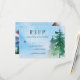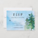 Mountain Wedding RSVP Card with number attending option. The card is decorated with tall pine trees on the right of the card with a blue sky watercolor background. The back of the card includes a beautiful watercolor mountain scene with water and a pine forest in the foreground. This rustic mountain reply card matches a collection in my store.