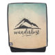 A backpack with an outdoorsy minimalist style. Designed with an illustration of a mountain with sunrays emanating from behind. The word wanderlust written below. Background is a parchment colour with a hint of blue. A design that may appeal to outdoor types involved in backpacking. hiking, mountain climbing, and camping.