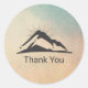 Thank you stickers with an outdoorsy minimalist style. Designed with an illustration of a mountain with sunrays emanating from behind. Background is a parchment colour with a hint of blue.