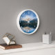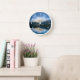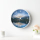 A clock with a beautiful nature photo. Mountains in the background with a calm still lake in the foreground. Serene and relaxing photograph.