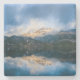 A stone coaster with a beautiful nature photo. Mountains in the background with a calm still lake in the foreground. Serene and relaxing photograph.