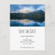 Save the date postcard with a beautiful nature photo. Mountains in the background with a calm still lake in the foreground. Serene and relaxing photograph.