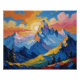 This digital illustration captures the majesty of mountains at dawn, bathed in a golden and ethereal glow. The work uses the audacious impact technique with thick and textured strokes that build the robust forms of summits and vibrant sky, inspired by Vincent Van Gogh's art. The chromatic palette focuses on the warm, intense gold and soft oranges of the rising sun, contrasted with the cool blue and purple of the morning shadows. The scene evokes a sense of serenity, hope and the immensity of nature. Ideal for those looking for art with an expressionist touch and the beauty of the Alpine landscape.