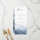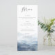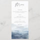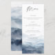 This wedding menu card features a watercolor mountain landscape in dusty blue. Designed for mountain destination weddings, national park ceremonies, and rustic outdoor celebrations, the aesthetic focuses on a scenic and organic nature theme.