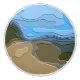 A bright, colourful abstract design of a mountain view, with blue sky, rock and trees.