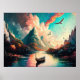 An Original painting of a lost fisherman finding his way back home on a lake that is surrounded by mountains and forests.