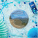 A bright, colourful abstract design of a mountain view, with blue sky, rock and trees.