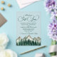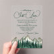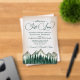 These beautiful acrylic wedding invitations are the perfect combination of rustic outdoor charm and modern elegance. The design features a watercolor landscape of rugged mountain peaks with a green pine tree forest in the foreground. The typography includes beautiful script lettering with swashes and flourishes reading: Nothing Fancy, Just Love. Perfect for a mountain resort or wilderness destination ceremony, and a wonderful way to invite your family and friends to share in your joy on your special day.