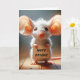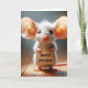 A charming cartoon mouse with oversized ears and watery eyes stands on a wooden floor holding a small piece of cardboard with Happy Birthday text.