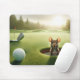 A cute mouse appears surprised as it peaks out of a golf hole on a lush green course with golf ball and club