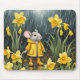 A cute grey mouse standing in the rain in a spring daffodil garden wearing a yellow rain slicker and boots