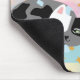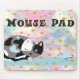 Cute black, white, grey and blue cat and mouse pad. The illustrated mouse is blue, and the background is mixed pastels with faux gold stars.