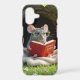 A grey mouse wearing glasses is reading a red book titled "Mouse Tales" while sitting on a fuzzy blanket