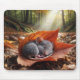 A small mouse peacefully sleeps curled up inside an autumn maple leaf on a forest floor