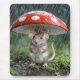 Cute mouse sitting under a polka dot toadstool in the rain.