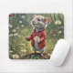Cute mouse wearing a red jacket and holding a fluffy dandelion in a garden.