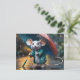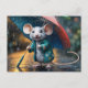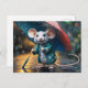 A little cheerful mouse is standing in the rain with a large umbrella. There are raindrops, puddles and colorful color flexes to be seen everywhere.