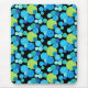 A vibrantly coloured Mousepad with a 'Blue Moons' abstract pattern in bright blues and neon green on a black background; from a handpainted paper collage design by Judy Adamson.