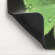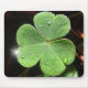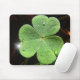 Ein grosses, grünes Kleeblatt mit einem Lichtsternchen am Blattrand vor dunklem Hintergrund ist auf diesem Mousepad.