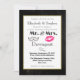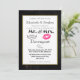 A modern style wedding invitation with pink kissy lips and a retro looking moustache illustration. Set on a black chalkboard background inside a gold bordered frame. Personalise with all your wedding details.