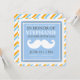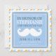 A custom baby boy invites featuring large moustache design and diagonal stripes in blue and orange colours combination with charcoal