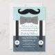 This cute moustache baby shower invitation is perfect for that new little man! It also features a bow tie, and suspenders in a mint, navy, grey and black colour scheme with a plaid backside.