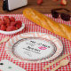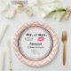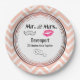 Personalised paper plates for a wedding anniversary with a trendy design - glamourous pink kissy lips and a masculine retro-looking moustache illustration. Retro looking words says Mr. and Mrs. and you can personalise with your name and years together. Set on a peach chevron background.