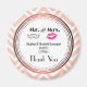 A thank you magnet with a modern wedding design - glamourous pink kissy lips and a masculine retro-looking moustache illustration. Set on a peach chevron background with a circle layered over top. Circle has a rose gold gradient border. Text inside says Mr. and Mrs. and you can personalise with your names and wedding date.