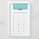 The Baby ABCs game is a fun activity for any Baby Shower, as guests try to fill in the cards with baby items that start with each letter of the alphabet. In a grey and turquoise colour scheme, this card features a moustache illustration. The perfect addition to a 'Little Man' themed Baby Shower!