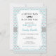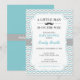 Modern Baby Shower Invitation featuring a turquoise and grey chevron pattern background and a dark grey moustache graphic. Perfect for a "Little Man" or "Moustache Bash" themed Baby Shower for a baby boy.