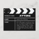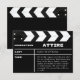 Premiere your big day in cinematic style with this creative movie clapboard wedding attire card. The perfect blend of modern and retro style for anyone who love classic Hollywood film and movie aesthetics. Personalize it with your own details and message and have your family and friends for dress to impress as your all star cast.