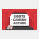This cool birthday party rectangle sticker has an at the movies theme! There are layers of red curtains all around a "screen" in the middle. At the bottom, there is a box of popcorn, a cup of soda, and a movie snapboard with a few pieces of popcorn on the ground. In the top of the movie screen, Lights, Camera, Action is written with two stars next to camera. Some elements are © 2012 Jessica Weible/JW Illustrations.