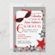 A birthday party invitation featuring an illustration of a pair of retro red cat eye sunglasses with rhinestones at top left. Bottom and right of invite is decorated with black, white, and red stars. Personalise the text with details of your occasion.