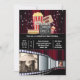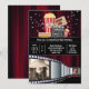 A fun and trendy illustration of a regal dark red draped curtain backdrop; sparkling fairy lights; popcorn; a hotdog; an access ticket; a clapper board with chalk writing on it and the negative from a camera spool that has a photo inlay for two photographs of the birthday boy or girl. All may be customised to suit your special celebration. Additional wording may be added to the back if required.