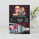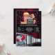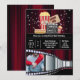 A fun and trendy illustration of a regal dark red draped curtain backdrop; sparkling fairy lights; popcorn; a hotdog; an access ticket; a clapper board with chalk writing on it and the negative from a camera spool that has a photo inlay for the birthday boy or girl. All may be customised to suit your special celebration. Additional wording may be added to the back if required.