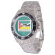 Has heft and feel of expensive stainless steel quartz watches. Good band with safety catch. I removed links, which is easy because engraved arrows show direction to push the linking pins. As always by this seller, the image (a railroad logo) is a perfect reproduction of my emailed image, and is precisely spaced and aligned.