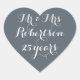 Personalised Mr and Mrs 25th wedding anniversary heart stickers or envelope sealers. Cute wedding day accessory for married couple, husband and wife or newly weds. Customisable number of years like 1, 5, 10, 25, 40 etc. Personalise colours i.e. grey and white. Vintage calligraphy handwriting typography template design. Add your own surname. Elegant stickers for decorations, party favours and more.