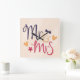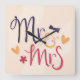 Square wall clock with the words "Mr. & Mrs" in a playful, cartoonish font. The word "Mr." is written in a deep blue color, while "Mrs" is in a vibrant pink. The ampersand is in a golden yellow color. There are small hearts and a bow tie scattered around the text, adding to the whimsical feel. The clock hands are black and simple in design. The background is a soft, creamy color, which makes the text and decorations stand out. The overall style is cheerful and celebratory, perfect for a wedding or anniversary gift.