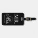 A modern, fun luggage tag featuring large Mr. and Mrs. text and family name below in a mix of gender specific fonts. Perfect for newly weds and honeymooners.