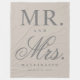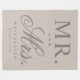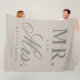 A personalised throw blanket featuring Mr. and Mrs. typography script and wedding date. This item makes a perfect gift for newly weds or married couples celebrating milestone anniversaries. The background colour and type is all customisable making it easy to match your personal home decor. Click the edit button to customise this design.