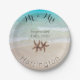 Starfish couple wedding paper plates with three areas of custom text. "Mr. and Mrs." at the top, with married surname at the bottom, curves around the edge of the plate. Dte of marriage and two brown sea stars in the centre. Everything is printed over a beach scene with turquoise water gently lapping the sandy beach.
