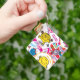 The key chain is made of metal and really sturdy. The flower design is really cheerful. The logo and colors are clear and crisp!