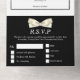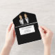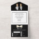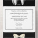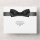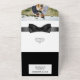 A beautiful all-in-one luxurious and glam invite featuring the blazer and bow tie of a formal black and white tuxedo set against a black and white background that has a tear off strip with a white bow tie that has your personalised rsvp address and meal options for your guests to complete. The top outside flap has a template for your special photo of the bridal couple and the background colour on both the front and back may be personalised to any of your choice. These are ideal for a spring; summer; fall or winter wedding; for a gay couple celebrating their vows