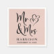 Modern personalised blush pink napkins for your wedding reception or other wedding events with "Mr & Mrs" written in a large elegant script and an illustration of two hearts joined together. Add your name and wedding date.