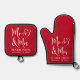 Personalised red oven mitts and pot holders for the newlyweds featuring "Mr & Mrs" in a large elegant white script and an illustration of two hearts joined together. Add their name and wedding date below in simple modern white typography.