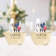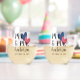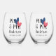 Custom stemless wine glass set with personalised last name, wedding date, and pink and blue hearts. The "Mr & Mrs" and last name are in brush script with the date in sans-serif typography. Click 'Personalise to edit the last name and wedding date to see how it looks.