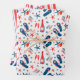Fun Mr and Mrs red blue white set of beach themed Americana colours wrapping paper. Champagne bottles and glasses, star fish and shells, star shapes, his and hers flip flop sandals are all featured on this bright seamless pattern. It also comes with a coordinating stripe design. Great for your friends and family members especially if they are getting married on 4th July, Independence Day. But also fabulous for any beach themed wedding.