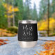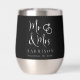 Custom black thermal tumbler to celebrate your wedding and anniversary featuring "Mr & Mrs" written in a large elegant white script and a white illustration of two wedding rings joined together. Add your name and wedding date in simple elegant white typography.