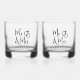 This custom whiskey glass set for the bride and groom features "Mr & Mrs" written in a large elegant script and an illustration of two wedding rings joined together. Add your name and wedding date.