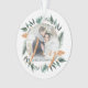 Celebrate the magical and festive holiday season with our custom newlyweds mr and mrs Christmas photo ornaments. Our elegant holiday design features our beautiful hand painted wintery foliage greenery of sage leaves, palm leaves and ferns with faux copper elements arranged to create an elegant holiday foliage wreath design around the photo. "Joy" is displayed over the photo in faux copper along with last name. The reverse side features the winter foliage frame with a second photo placeholder and the year. All illustrations contained in this wintery sage green and copper foliage holiday photo ornament are hand-drawn original artwork by Moodthology. You can customise the text size, text colour, font and layout for your own personal design preference.